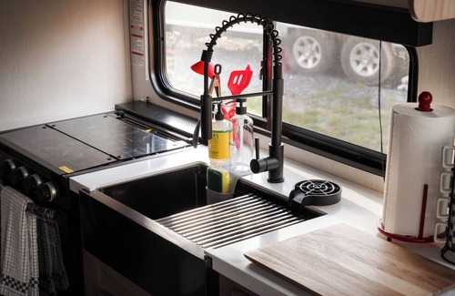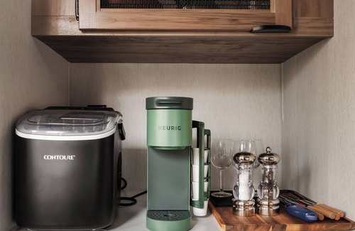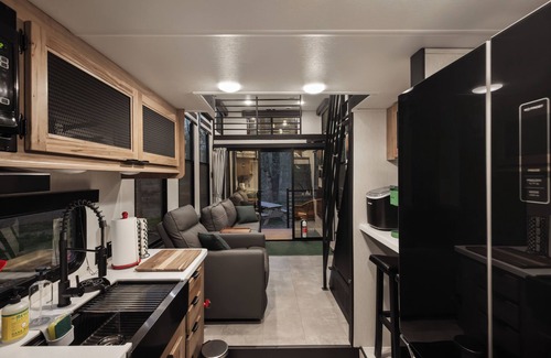 Our tiny house camper is fully equipped to make your stay comfortable! Inside, you'll find a spacious full bathroom with a shower, a well-stocked kitchen, and heating/AC for year-round comfort. The living area features a recliner and a full-size sofa bed, while the main sleeping space in the loft includes a cozy queen-size bed. The kitchen has everything you need: a propane range, fridge with top freezer, microwave, cookware, plates, bowls, cups, wine glasses, and flatware. And yes—coffee is provided for those slow, peaceful mornings. We’ve also stocked the camper with towels, bar soap, shampoo, conditioner, body wash, hand soap, dish soap, and a hair dryer for your convenience. Wi-Fi is available in most areas of the site.
