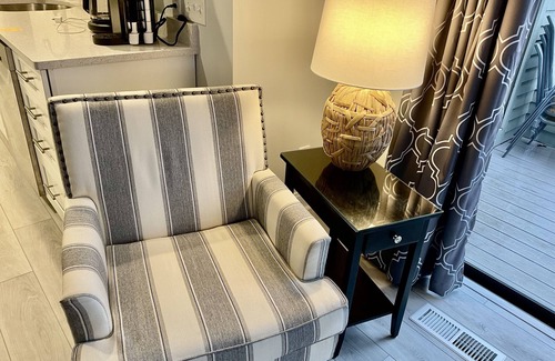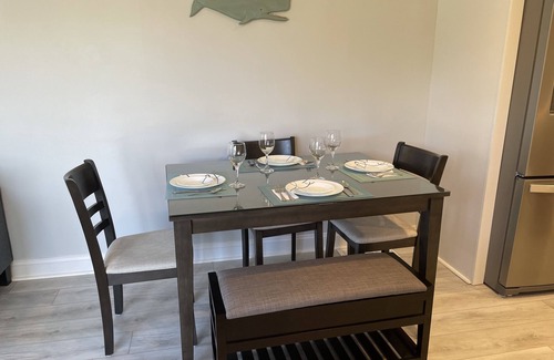 The fully-equipped kitchen features up-scale stainless steel appliances and quartz countertops. Cooking is with natural gas on the range with an electric oven for baking, the best of both worlds! Cook your scrumptious, local seafood on the grill by the deck. The kitchen has all the conveniences of home. The counter-top appliances, dishes, glassware and a large assortment of utensils make meal preparation easy and enjoyable. A coffee/wine bar is a convenient and unexpected amenity. The dining area provides comfortable seating for a peaceful meal after your busy day.