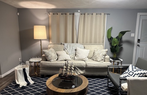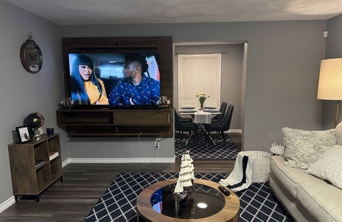 Our Duplex is Located in a quiet and safe neighborhood, with a fully furnished living Rm that includes two bedrooms with comfortable beds and a TV, a full bathroom, a spacious living room with a TV, and a fully equipped kitchen for all your cooking needs.