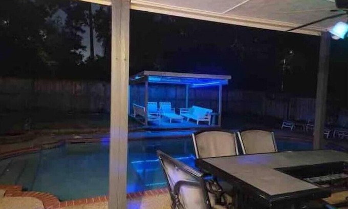 4BR/3B. Use indoor club room as a lounge, a nightclub vibe - music & bar, or movie theater. Elegant backyard w/pool, grill, TV pergola with surround sound & LED disco lights, a bar, & gazebo to enjoy movies, sports & company.