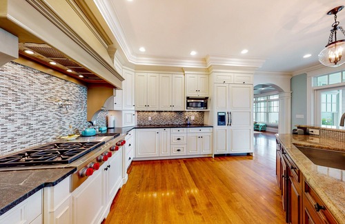 Upon entry, you'll be met with a bright interior and a cozy atmosphere throughout the well-appointed living area. Marvel at the high craftsman-style ceilings, the upscale furnishings, and the natural light pouring in from the large windows, radiating comfort from every corner. Relax and make yourself at home by resting on the plush furniture, streaming your favorite movies on the large TVs, or serving up brunch outdoors while watching the sailboats. For those who need to bring work with them, a dedicated workspace with a chair and desk is readily available, with the third-story office atop the home with 360-degree views specifically built to mimic the interior of a classic yacht. Prepare grand meals and beach picnic snacks in the tasteful chef's kitchen, equipped with state-of-the-art appliances, a floating island breakfast bar, and an exquisite dining room.