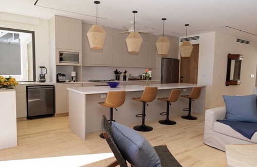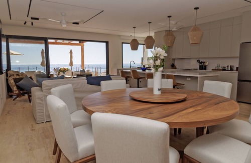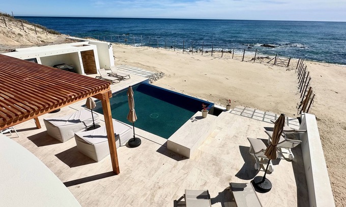 Exquisite 5-star luxury casa offering an unrivaled beachfront experience. Where the pristine beach is your backyard and every moment is a postcard of natural beauty. Pezula Beach is a newly-built (2023), contemporary, private, secure, oceanfront home on the East Cape of Cabo. An eco-friendly, air-conditioned dream home with saltwater pool inclusive of multi colored mood lighting, indoor and outdoor kitchen and dining, marble throughout, 75" inch TV, 3 bedroom suites and 3.5 baths - all with breath-taking views to take in the surf, sun and whale watching. Step off the pool deck and onto the pristine beach where you can enjoy sunbathing, swimming, kayaking, paddle boarding and surfing. Amenities include a ping-pong table, fire-pit, paddle boards, on-site staff to change linens every 3 days. Additional services available upon request. Option to add 2 additional suites in the adjacent property by contacting host. This enchanting getaway is 30 minutes from downtown San Jose Del Cabo and 20 minutes to Flora Farms and Acre farm-to-table restaurants. Shipwrecks surf beach a mile south and La Fortuna surf spot half a mile north with 3 restaurants, Zai Sushi, Lateral and Shade. Leave the world behind and enjoy beachfront luxury along the untouched East Cape coast of Cabo!