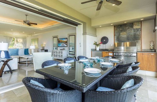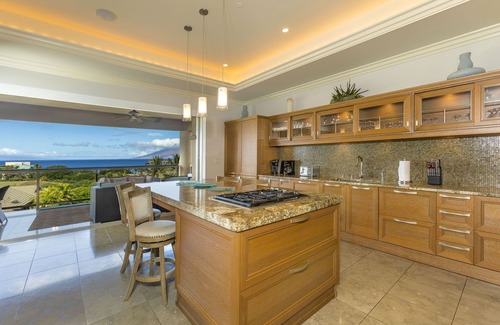 modern gourmet kitchen and Wolf gas grill. Relax in your open and inviting living area. With direct access to private lower lanai from your primary Suite, drift off to sleep with the soothing sound of the Pacific Ocean.