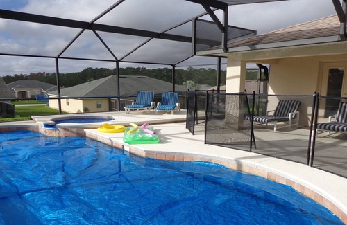 You will enjoy a screened, south facing pool and spa and a large L-shaped lanai with fans, lights and padded pool furniture. The pool is south-facing. Pool and spa heating is available upon request and for an additional charge. The pool has a child safety fence to help protect your children. The pool area is private – it is not overlooked.