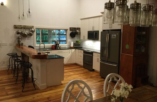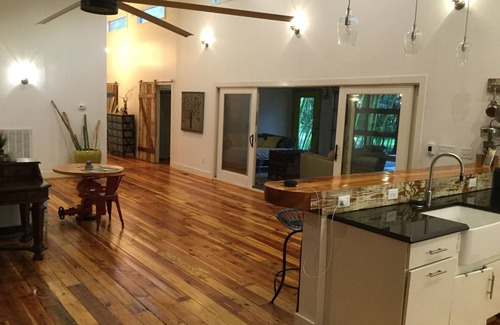 Are you in need of a temporary home? This fully-furnished contemporary house in Burlington is a perfect alternative to a long term hotel stay. Our ideal guests are companies/individuals working long term projects in the area; corporations needing housing for sales teams, management teams, executive relocations; owners displaced while building or waiting for a home etc. This house features an open floor plan perfect for entertaining. Built entirely out of repurposed materials, the beams and flooring are 100+ year-old heart of pine. Barn wood and reclaimed tin accent the entrance and sunroom. The 600 sq. ft. sunroom has 4 garage doors opening to a 600 sq. ft. deck overlooking the water to create a perfect outdoor retreat. There are 5 bedrooms and 2.5 baths; two of the bedrooms have lofts for additional sleeping areas. The kitchen is modern and fully furnished. The setting is very tranquil and private, nestled in a 10 acre compound with a bamboo grove and majestic oak and hickory trees providing shade and privacy. Lots of wildlife around including deer, foxes, rabbits, squirrels, and herons. The location is close to everything (grocery stores, restaurants, shopping, hospital, movies, etc) but it feels like you are in another world. Try to catch a bass or bluegill in the two acre pond, hike thru the bamboo trail or use the kayak or canoe over by the gazebo. The setting has to be seen to be believed. Up to two well behaved dogs are welcome.