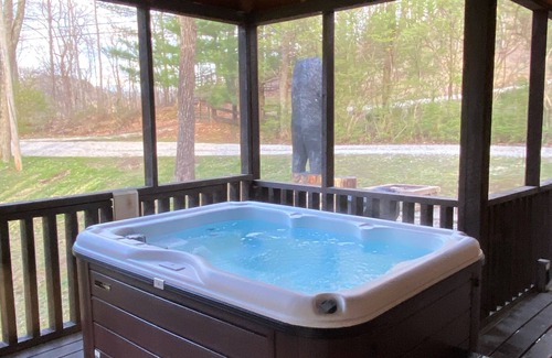 We just added the resort style screened in porch which adds a unique dimension to getting away. You can enjoy the outdoors without the rain, sleet or snow hindering your enjoyment of the hot tub, surfing the net, dining, bringing most desired activities you do inside the cabin to the outside undisturbed. Cook out on our all new park style charcoal grill with cement pad in a bed of river rock then chill enjoying a good meal in the comfort of your private 'Resort room'. We have 'Barley' the over 11ft friendly bear who loves getting his picture taken. Twin Knobs has a lake beach and a "private vendor", who rents our kayaks and canoes. Cave Run Marina rents out Pontoon, fishing and paddle boats on a 10 mile lake. Red River Gorge offers horseback riding , ziplining, a Sky-lift, rock climbing, caving, trade shops and eateries etc...