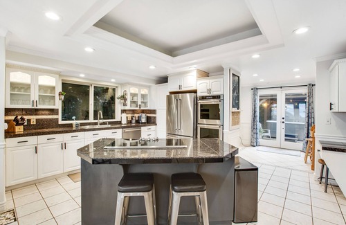 The second floor offers a sunny lounge space with carpeted floors and beautiful water views. Snuggle up on the extensive sofa and stream a favorite show on the gigantic smart TV. Feeling a tad cold? Let the gas fireplace warm you up in the blink of an eye! The chef of the group will have their own playground with a marvelous and well-equipped kitchen! It's open and spacious and boasts stainless steel appliances, including a double-door fridge, dishwasher, stovetop, microwave, and double built-in ovens.