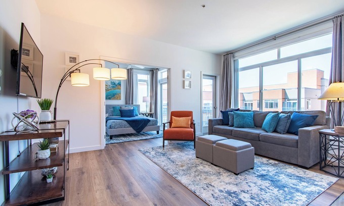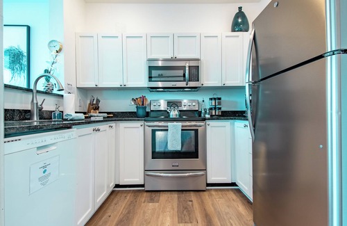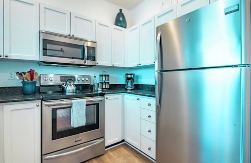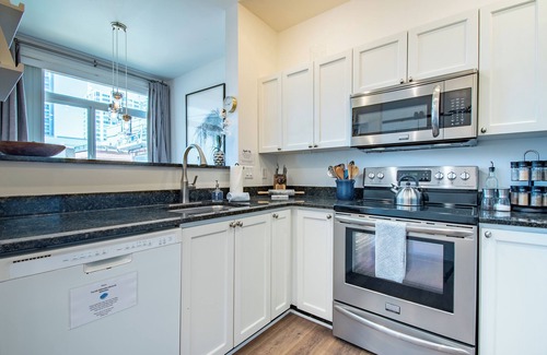 Our home has modern furnishings, a smart television in the living room and master bedroom. In this space, you will have 1 brand new king sized bed in the master bedroom with a walk-in closet, 1 extremely comfortable queen sized bed in the 2nd bedroom, and a premium sleeper sofa (it is actually comfortable!) in the living room to add an extra sleeping option when needed. We also have a memory foam floor mattress to add an additional sleeping space as well. The kitchen is fully equipped to please any cook, and there is a washer/dryer in the condo for your convenience. Tall oversized windows throughout the condo provide plenty of natural light and a beautiful garden view- you'll hardly know that you are in the center of the city. Our home also includes wireless internet and a large electric air conditioning unit.