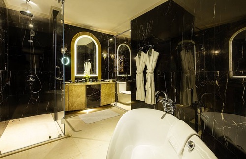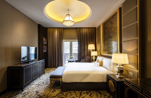 Ezdan Palace Hotel offers 195 air-conditioned accommodations with fireplaces and minibars. Rooms open to balconies or patios. Beds feature premium bedding. A pillow menu is available. 49-inch Smart televisions come with pay movies. Bathrooms include separate bathtubs and showers, bathrobes, slippers, and designer toiletries.