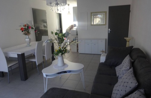 In modern secure residence capacity 4 people, nice apartment, all comfort type T2 on the ground floor with large terrace. Entrance to large living room and open kitchen: table with 4 chairs, sofa 5 seats convertible sofa, coffee table, TV cabinet, television 80 cm, Covered terrace with 1 table and 4 chairs