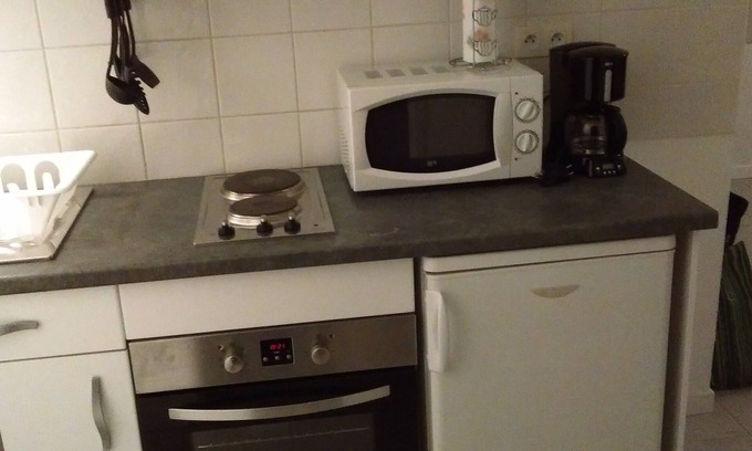 Fitted kitchen: microwaves, oven rotisserie, 2 electric plates with timer, built-in refrigerator, coffee maker, kettle, toaster. Various dishes, various glasses, bowl, cup of coffee, pan, wok, pot, mini fryer, stainless steel houseware, kitchen knives, spatula, salad spinner, can opener, etc ...
