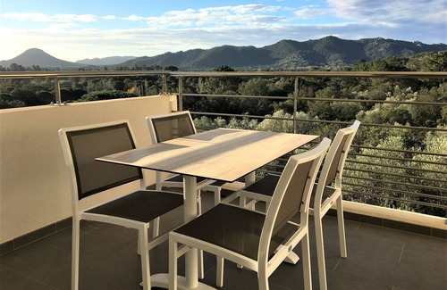 - A terrace of 10 m2 covered and equipped with a table for 4 people, 4 chairs and a plancha. Without vis-à-vis, with a superb view on the green hills