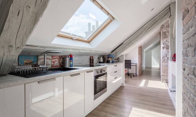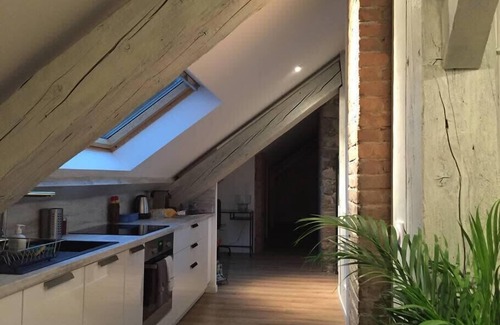 This is an apartment on the top floor under the roofs, with large velux windows to give a lot of light.🌞
