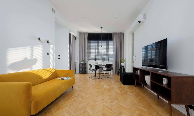 This cosy apartment is located on Fabryczna Street in Warsaw's Srodmiescie district in the very centre of the capital. The location is perfect for those wishing to visit Warsaw as well as for business travellers. Some of the most important tourist attractions are within walking distance of the flat. The Palace of Culture and Science is 2.6 km away and the Royal Baths Park with its numerous walking paths is 750 m away. The Old Market Square with the Royal Castle is approximately 15 minutes away by car. The developed commercial and service infrastructure with numerous shops, restaurants and cafes will significantly influence the comfort of your stay and make your time in Warsaw more pleasant. Additionally, there are bus stops available in the neighbourhood, from which you will be able to travel to further corners of the city by well-developed public transport. The nearest railway station Warszawa Centralna is only 2.9 km from the flat, which is very convenient for guests travelling by train. Getting to the Fryderyk Chopin Airport takes about 25-30 minutes by car, and about 45 minutes by public transport.