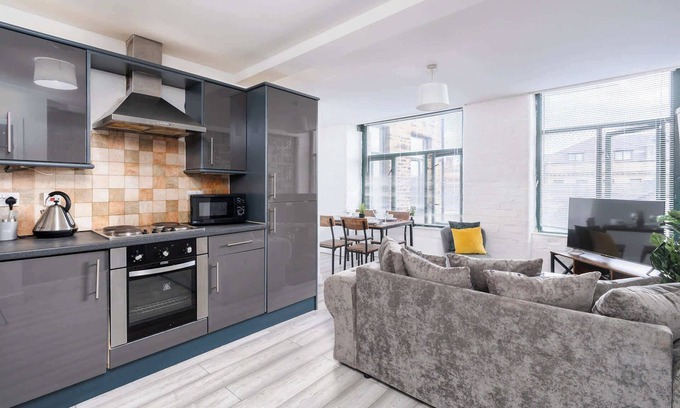 This spacious and bright 2 bedroom apartment is perfect for your stay in Bradford! The apartment sleeps up to 4 guests across 2 bedrooms, and features a fully equipped kitchen/open plan living space and a modern bathroom.