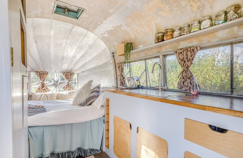 Bedroom area: Double (4ft 6in) Bed. Electricity, gas, bed linen, towels and Wi-Fi included. Welcome pack. External shower room with shower cubicle, toilet and heated towel rail (private). Front decking with garden furniture, sunken bath, BBQ and firepit. Private parking for 1 car. No smoking.. Set within the owners’ garden, this fabulous, quirky Airstream is the perfect place for a romantic getaway from the hustle and bustle of daily life. The living space is all open plan, and the external bathroom, which is behind the airstream, has a waterfall shower. A fabulous sunken bath on the decking area allows you to watch the night skies with a glass of something fizzy, whilst relaxing in the tub.