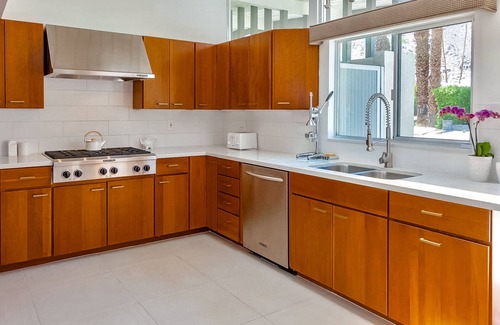 It doesn't get more classically Palm Springs than this mid-century Alexander home in Vista Las Palmas, built in 1958 and beautifully updated and reimagined in the years since. Designed by the legendary architect William Krisel and nestled at the base of the mountains, this home offers luxury, comfort, and impeccable style in one of Palm Springs' most exclusive neighborhoods. Step inside to find walls of glass, inspired retro-chic design, deluxe bathrooms, an updated kitchen, and three flatscreen TVs. The gorgeous, resort-style backyard is framed by the mountains, featuring a shimmering pool with a spillover spa, a lush lawn, and space to grill, dine, and lounge in the sun and the shade. At night, you'll have four bedrooms to choose from - three master suites with a king-size bed apiece and a fourth bedroom with a queen-size bed and a private patio.