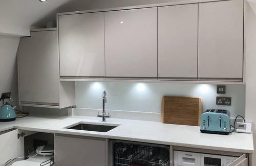 It benefits from a cashmere gloss handleless kitchen built-in Siemens fridge, Bosch freezer, Neff dishwasher, Bosch washer-dryer, Samsung induction hob and Bosch oven. Complete with white quartz solid stone worktop and oversized stainless steel sink as well as carousel corner unit.