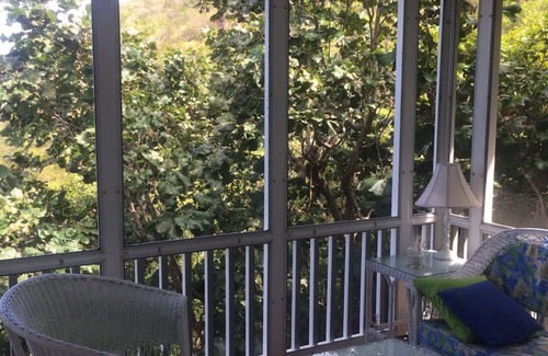 The cottage has a large ceiling fan in the inside area and 2 fans with lights in the outside screened in porch area. We usually have a nice trade wind that blows, so that alone keeps things cool along with all the vegetation around the cottage that helps with cooling things too. There isn’t any formal garden area to sit in outside as the cottage is tucked into the hill overlooking Oualie Bay, but there is a separate outside unscreened porch area that you can sit on and enjoy the views to the ocean.
