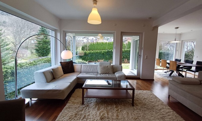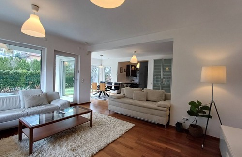 Spacious lodge in heart of KaprunThe modern Falcon Lodge is a cosy house with lots of natural light. It is situated in the famous town Kaprun with a lot of space inside and a magnificent view of the majestic mountains and the Kitzsteinhorn glacier. This holiday home from home has space to accommodate up to eight people, making it ideal for the whole family or the perfect holiday with friends! Just so there isn’t a scramble for the bathroom in the morning with ensuing logjam, the holiday home boasts two modern bathrooms – the smaller bathroom is equipped with a shower, washbasin and toilet, and the second and larger bathroom is equipped with a bathtub and shower as well as a double washbasin and toilet. In the kitchen, would-be chefs will be delighted with the excellent equipment which will allow them to create their signature dishes for all to share. Eating together at the large table with a view of the garden will be one of those wonderful experiences that will stay in your memory for a long time after. Lodge at a glance:•Accommodates up to eight people•Free private parking for three cars at the apartment building•Private double-car garage•Bread rolls or breakfast can be ordered from the local bakery (for an additional charge)•Free use of the washing machine and dryer in the lodge building•Fenced-in, well-kept garden with a mountain panoramaThe patio with its seating is covered. From the garden, you have a wonderful view of the mountain panorama. There are several parking spaces available and there is a children’s playground nearby. The ski bus stop is only 150 m away (not far, is it?). The ski bus will whisk you away to the Maiskogel resort and the ultra-modern 3-K K-onnection cable car in winter which links directly to the Kitzsteinhorn glacier.Enjoy to the full with everything you need:•Three bright bedrooms (one with two single beds – can be connected to form a double bed if required and two bedrooms are each furnished with a double bed)•Two modern bathrooms (one with a walk-in shower, washbasin and toilet, the other with a bathtub and a shower, double washbasin, toilet and hairdryer)•Large, well-equipped kitchen with oven, ceramic hob, fridge with freezer compartment, Nespresso coffee machine, filter coffee machine and kettle•Living room with a corner leather sofa, sofa bed and TV•Dining table for eight people with a great view of the gardenLocation:Kaprun is wonderfully situated between Lake Zell and the Kitzsteinhorn. Want to get moving and active? Well, many bike trails and hiking paths are waiting for you to discover. Fancy cruising or flying down the slopes? Skiing is possible from autumn to early summer. The Kitzsteinhorn Glacier is known for its guarantee of snow. For connoisseurs of good food, après ski and socialising, Kaprun offers a varied range of cuisines, entertainment and activities. Free time:You can reach the Kitzsteinhorn in summer and winter with the Glacial Aerial Tramway Kaprun. The ski area is located at over 3,000 m above sea level and is the epitome of absolute fun and enjoyment on the slopes – it really doesn’t get any better than this on skis. If you have the urge to go tobogganing with the whole family, the “Maiskogel” family mountain with the “Maisi Flitzer” all-season alpine coaster is highly recommended!The famous and absolutely stunning Sigmund Thun Gorge is located in the Kaprun area. This marvel of nature is 320 m long and 32 m deep. In summer, hikes through the gorge are possible and, in the evening, it is often beautifully illuminated – a sight to behold. Fans of mountain biking – beginners and pros alike – can work up a sweat as they power along trails with a combined distance of 242 km. This includes four exciting freeriding trails in and around Kaprun. Not forgetting the famous Krimml Waterfalls. These falls offer a very special highlight for your dream holiday, not only because these waterfalls are the highest in Europe but the backdrop to the tumbling water is sure to amaze you with its beauty and majesty!Nothing stands in the way of your dream holiday in the Austrian Alps with Steinbock Lodges. Book today!