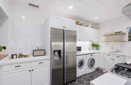 The stylish white galley kitchen is well-equipped and spacious, making cooking easy with stainless steel appliances, plenty of counter space for meal prep, and dishwasher for easy clean up. Guests can enjoy their favorite homecooked meals at the 4-seat dining table just next to the living room. Step outside to the sunny patio with a gas grill for those who love to cook and eat alfresco.