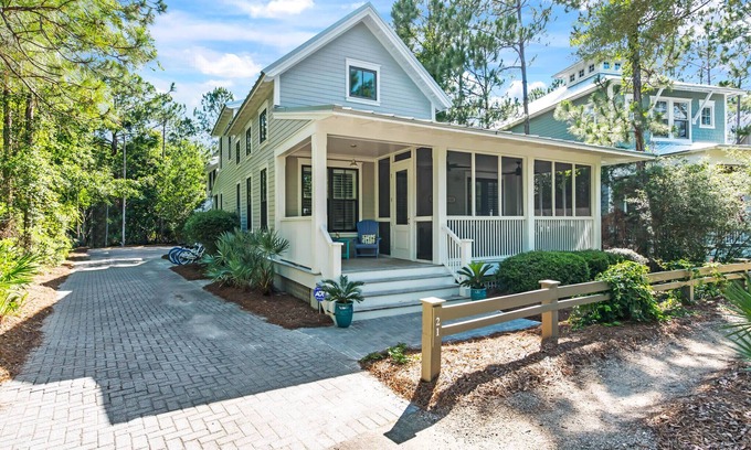 Two screened porches offer guests the perfect place to enjoy this home's beautiful surroundings and the tranquility of a stay in the Camp District. This home is equipped with 4 custom 360 Blue adult beach cruiser bikes, which provide a picturesque ride to the sugar-white sand beach and through our scenic 30A coastal towns.