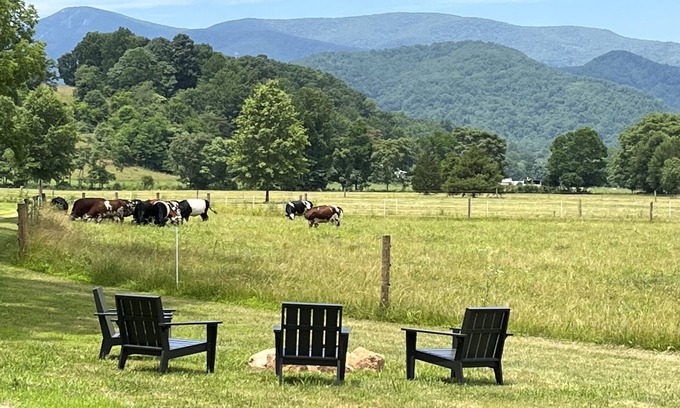 Dreaming of viewing picturesque mountains, the sunset and a sky full of stars? Itching to hike, bike, fish, winery or brewery hop? Have you always wanted to have cow neighbors? Each is just minutes away on our farm. Our mid century modern retreat is the perfect way to unwind and enjoy the beauty of nature. Wildlife are often common including the occasional bug! This is a working farm so you may also see the farmer and his equipment. You may also get a visit from our two blue heeler mix puppies. They are very sweet and usually visit for just a minute. All fences are electric even in fields where there are not cows. We do hunt during the season but will always respect your privacy and safety.