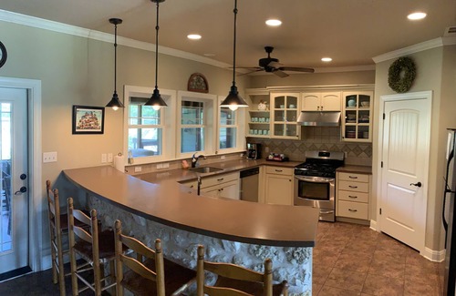 The lodge is a duplex-style structure with 2 full living spaces under one roof, separated by a spacious utility room with a 1/2 bath. With almost 3800 square feet total, there's plenty of space for you and your guests to spread out. Each living space has it's own entrance, porch, fully stocked kitchen, great room with wood-burning fireplace, and screened porch. All rentals are exclusive to one party only! We will never double-book rentals, so, if you stay with us, the place is yours alone for the duration of your stay.