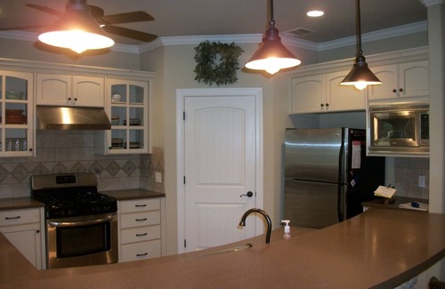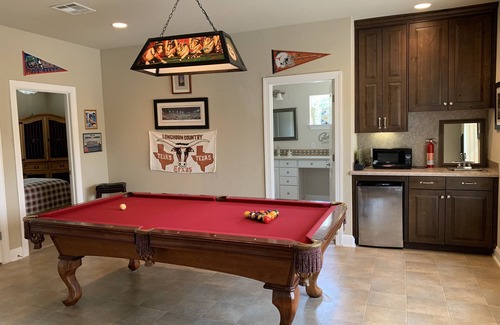 The upstairs opens to a game room and common area with pool/ping pong table, galley kitchen with sink, microwave, mini-fridge, and a wall-mounted large screen TV. A full bath with walk-in shower is adjacent to the game room. There are three upstairs bedrooms which include: (a) 1 queen, 2 twin beds, large screen TV; (b) 1 double, 2 twin beds with a walk-through closet to the full bath with shower (this bathroom also opens out to the common area); and (c) 1 queen, 1 twin bed, with a private bathroom and shower/tub combination. Bedroom (c) is semi-private from the other bedrooms with a connecting door, and has its own staircase.