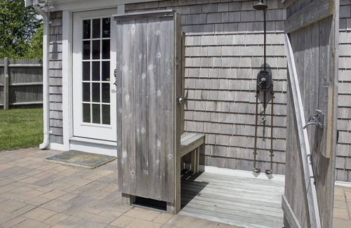 Finally, step out on the patio. There's an umbrella table for al fresco dining or savoring a vacation cigar (no smoking indoors please). The outdoor shower features whale tail hooks, mahogany bench and floor that blends seamlessly into the patio.