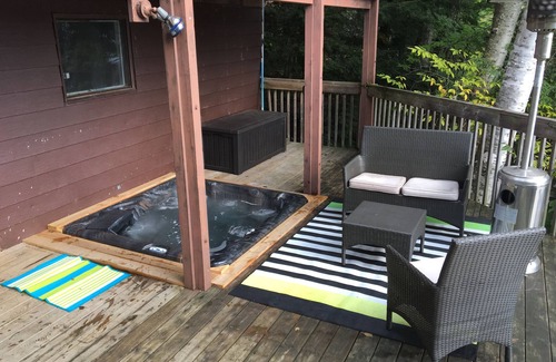 The Main deck downstairs has a sitting area and an area to eat and a hot tub.