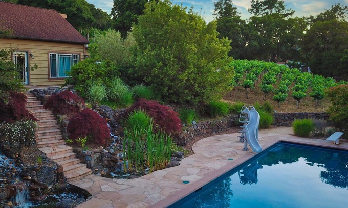 Professionally cleaned detached home nestled among an oak grove, waterfall & vineyard in the hills above Stanford (10 min), Palo Alto (20 min), Menlo Park (10-20 min), Mountain View (25 min) and San Francisco and San Jose. Perfect for traveling families and groups, as well as startups visiting Silicon Valley or conducting off-site meetings. Amenities include private pool, spa, sauna, tennis, pickleball, basketball, putting green & trails. Please read this entire listing for full details.