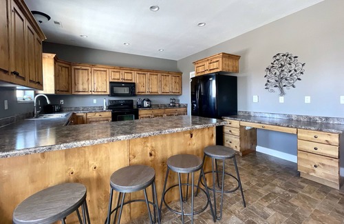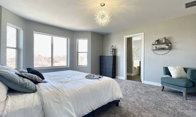 Spacious 4200 sq foot 2 story home and basement apartment with room to spread out and have your own space or gather together. There are 2 kitchens and large open living rooms on each floor, plus a huge theater room with surround sound. 7 bedrooms, 4 1/2 bathrooms (including two master suites with attached baths) Large open floor plan for family friendly get-togethers, located in a quiet cul-de-sac. Large patio with lighted pergola, hot tub, bbq, firepit, outdoor dining, and no backyard neighbors. Close to several parks, Cherry Peak resort and USU.