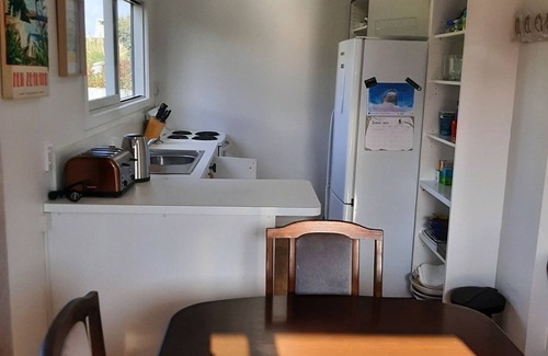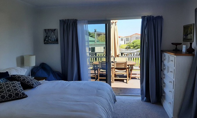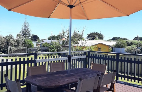 Our beach house is a double-glazed, child friendly home. It has a filtered tank so you can drink the water from the tap. The Bach is situated a short 5 minute walk from the beach and close to the Four Square, cafes, gift shop, galleries, bowling club and two playgrounds. The house is fully fenced with a large section for the kids to play on, along with a deck and furniture. It has a new bathroom, heat pump, two separate bedrooms and the master bedroom off from the lounge. There is also a soccer goal, netball goal and a cricket set for the kids to use. There is a TV for DVDs (100+ to watch), but no Freeview. The neighbours are fantastic too!