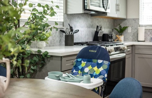 Family friendly as mentioned, also with child-size plate/bowl/cup/utensils provided. In addition, the "cloud-box" can create nature sounds, white noise or tell stories to your little ones, all while lighting up the room with shapes and colors (instructions in the guest manual in the home). Two kiddos? No problem! - the home has 2 high chairs and 2 pack and plays, complete with additional mattresses for extra comfort. We also provide electrical outlet covers for your use.