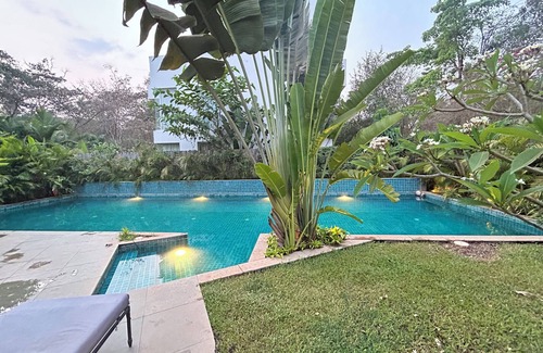 Unwind at this artistic duplex garden villa, located in a secluded & peaceful residential gated complex. Sip your drinks as you enjoy the serene forest view from the living room and lush private garden. Swim in the swimming pool, then fall asleep in the cool, ultra comfortable bedrooms or if you're well rested then sink into the plush sofa cum bed in the living room and enjoy watching your favourite shows/movies on our grand 70 inch smart TV. While you're at it pamper yourself with the personal caretaker who is there to serve your every need.