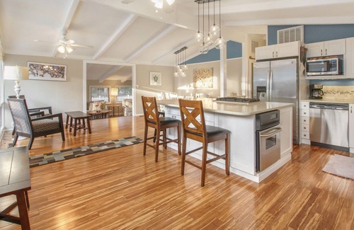 Entering the home, guest will be greeted by an airy, open-layout kitchen and dining area. Strong natural lighting features prominently throughout the single-level floor plan. The island kitchen is well-equipped for homemade meals with stainless steel appliances, including a dishwasher. A breakfast bar offers seating for four and the indoor dining table is set for six. To the left of the kitchen, a cozy family room is ready for family movie time, with wraparound sofa, chaise, and wall-mounted flatscreen TV. On the other side of the kitchen, a spacious three-season room features a patio dining table set for six and the indoor hot tub. The backyard can also be accessed through here.