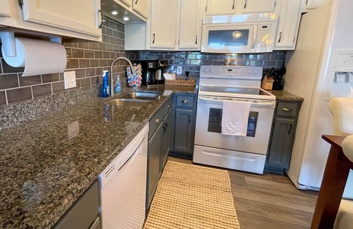 The condo is family-friendly. With only one stair step to enter, it is easy to carry in kiddos and luggage. You can find a high chair and pack n' play (including sheets) in the closet in the bunk room. We have also made sure to "baby-proof" the place by installing child locks on the cabinets with cleaning supplies, outlet covers on all the accessible outlets, and safety screens along the deck railings so that no babies can squeeze through or toss over binkies.