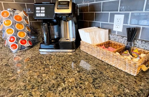 The coffee bar has a two-in-one 12 cup drip coffee pot and Keurig. We have several K-Cups available, including multiple coffee blends, tea, and hot chocolate. The bar is also stocked with sugars and creamers.