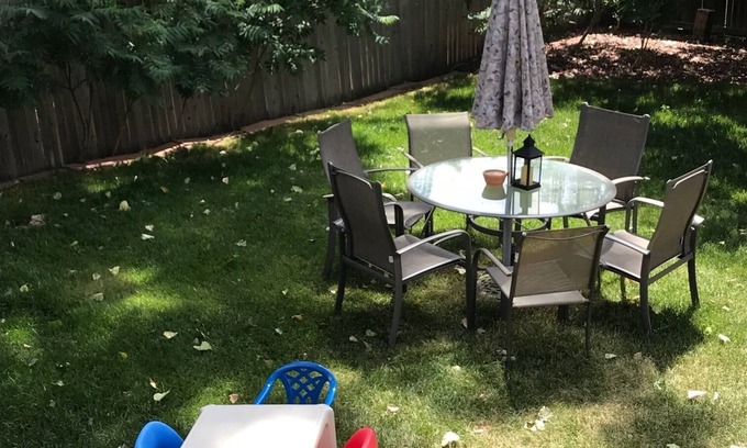 I have a large backyard with patio furniture, toys and two decks; for morning coffee sipping on top or eating at the picnic table in the shade below. There is a gas grill with grilling utensils for you and even in rainy weather, as it is covered.