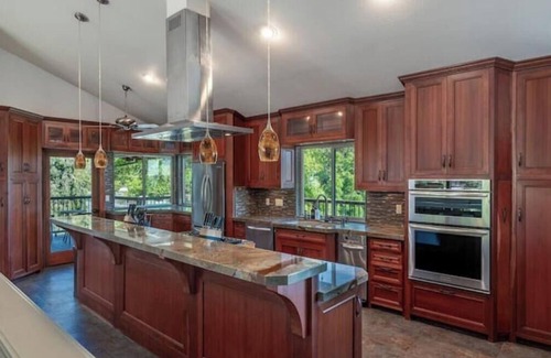 With over 3,200 Sq ft of interior space and almost an acre of outdoor area, this spacious retreat comfortably sleeps 12 guests across 5 bedrooms and 4 bathrooms. The open-concept kitchen is a chef’s dream with high-end KitchenAid appliances, granite counters, and stylish finishes. Wind down in the large family room or treat yourself to the serene primary suite with private sitting area, walk-in closet, and direct deck access.