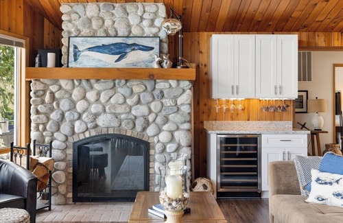 The expansive deck features a gas fireplace and a covered patio—perfect for sipping wine under the stars. Take a dip in the private swim spa or lounge in Adirondack chairs by the beach while soaking up panoramic waterfront views.
