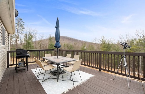 When you pull up, you'll see our cedar columns and mountain views straight away. Inside our home, you'll find open and spacious rooms, allowing everyone to hang out together without feeling cramped. Whether you're looking to relax or socialize, this house offers accommodating spaces. The fully-stocked kitchen is perfect for home-cooked meals, with a full-size dining table or the option to dine on the deck with mountain views. Our home is actually in view of the famous Stoney Man Overlook in Shenandoah National Park!