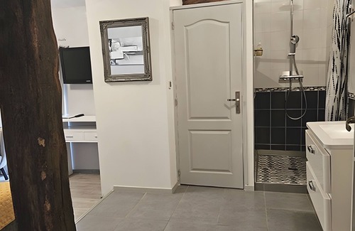 Located in Neuville-de-Poitou, just 10 minutes from Futuroscope, this family guest room offers 2 rooms (15 m² each) for up to 5 guests. The first bedroom features a double bed, walk-in shower, separate toilet, bedside tables, desk with chair, armchair, storage, and TV. You have access to the estate’s Wi-Fi. The second bedroom, connected by a private hallway, includes a double bed and a single bed with park views. Depending on the season, underfloor heating or cooling ensures your comfort.