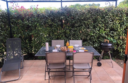 A 3X4 terrace not overlooked with garden furniture, a table/chairs and two deckchairs as well as a barbecue.