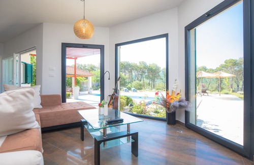 A dream vacation begins with opening of the door of our house located in the green idyll of a fragnant pine forest.Refreshment on summer nights brings a beautiful pool with massage and crystal water.Each room has a king size bed and private bathroom.Everything is designed to provide comfort but also fun to your children,which awaits the magnificent Mediterranean garden full of surprises.Reality much more beautiful.. in green paradise you easily become our faithful guest and we your caring hosts.