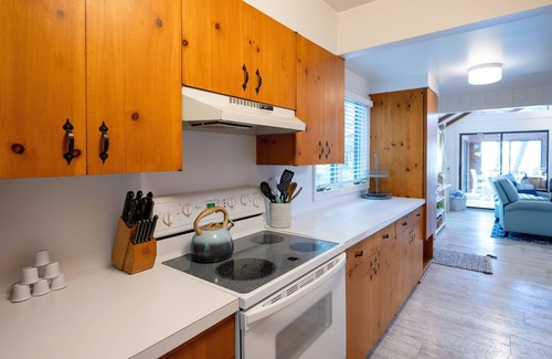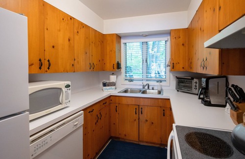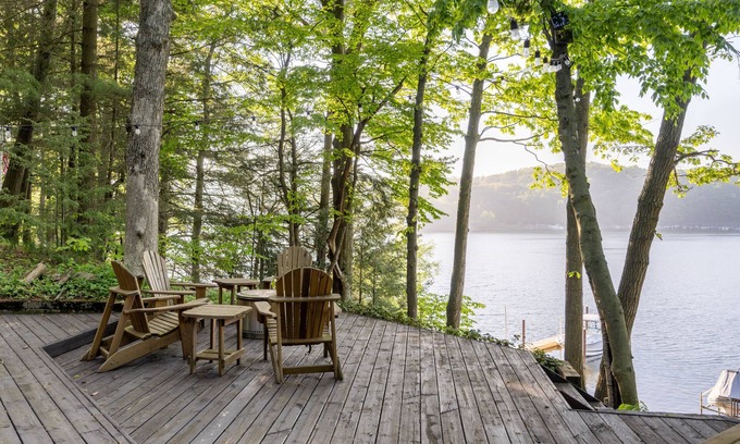 Inside, the open concept living area is warm and inviting, with ample natural light and rustic charm. The fully equipped kitchen provides everything you need to prepare meals to share at the dining area overlooking the lake views.
