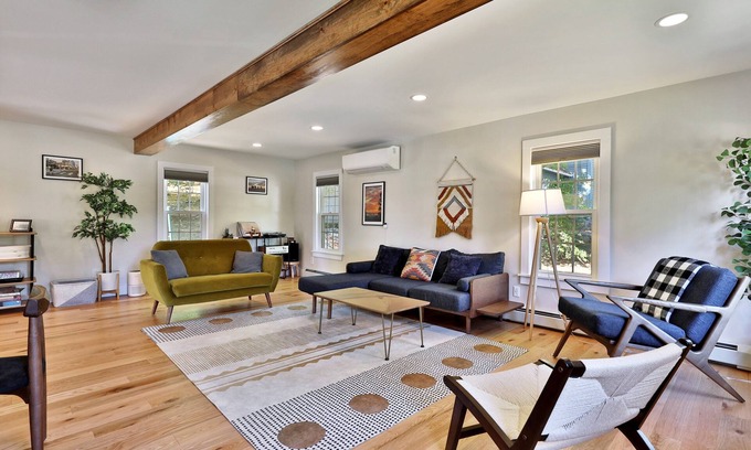 The spacious living area exudes rustic sophistication, featuring wide wood plank floors, chic furnishings, and a large smart TV with all your favorite streaming services. Enjoy family game nights with a generous selection of classic board games, including Scrabble, Monopoly, Pictionary, and Dominoes, or lose yourself in a large jigsaw puzzle. For the younger ones, there's a playful haven filled with Duplo Legos and beloved games like Candyland and Chutes & Ladders, ensuring fun for all ages.