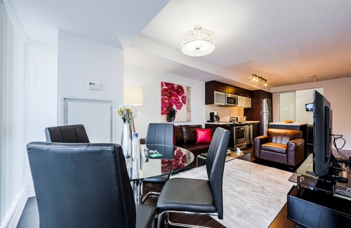 Stunning family friendly 2 Bedroom 2 Bathroom city center suite with a walkout balcony in one of the best areas of downtown Toronto - College Park. 24 hour security, state of the art fitness center / gym. TTC subway station and a large indoor shopping mall with a Metro grocery store, Marshall's, IKEA, Starbucks, pharmacies, banks, cafes, restaurants, and government offices are a very short walk away. UHN Hospitals (Sick Kids hospital, Toronto General hospital, Princess Margaret hospital, Mount Sinai hospital, Toronto Rehabilitation Institute, and Womens' College hospital) are a very short walk away.