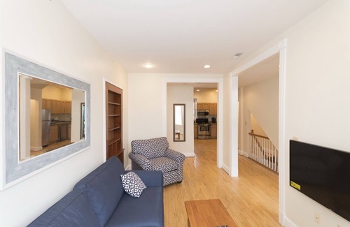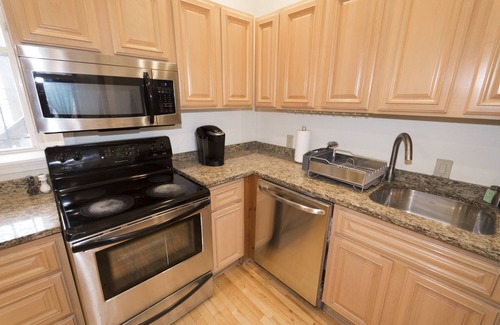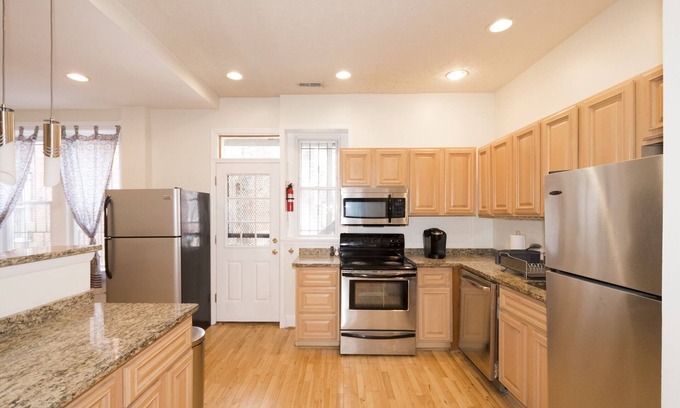 The Charmer is a duplex designed to maximize comfort. Living rooms on two levels come with cushy sofas and large TVs. A chef's kitchen is fully equipped for morning coffee from a Keurig pot or full meals served on a large dining room table. The heating/cooling system is zoned to accommodate different climates on each floor. Four of the 5 bedrooms are furnished with queen-sized beds and three of the bedrooms are connected to bathrooms. Parking for two cars is available behind the house.